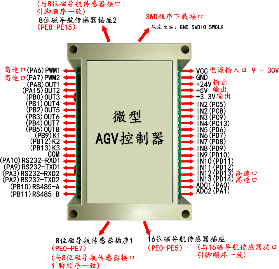 6、8位磁導(dǎo)航10pin座輸入口2路,可直接與8位磁導(dǎo)航傳感器連接及供電;
